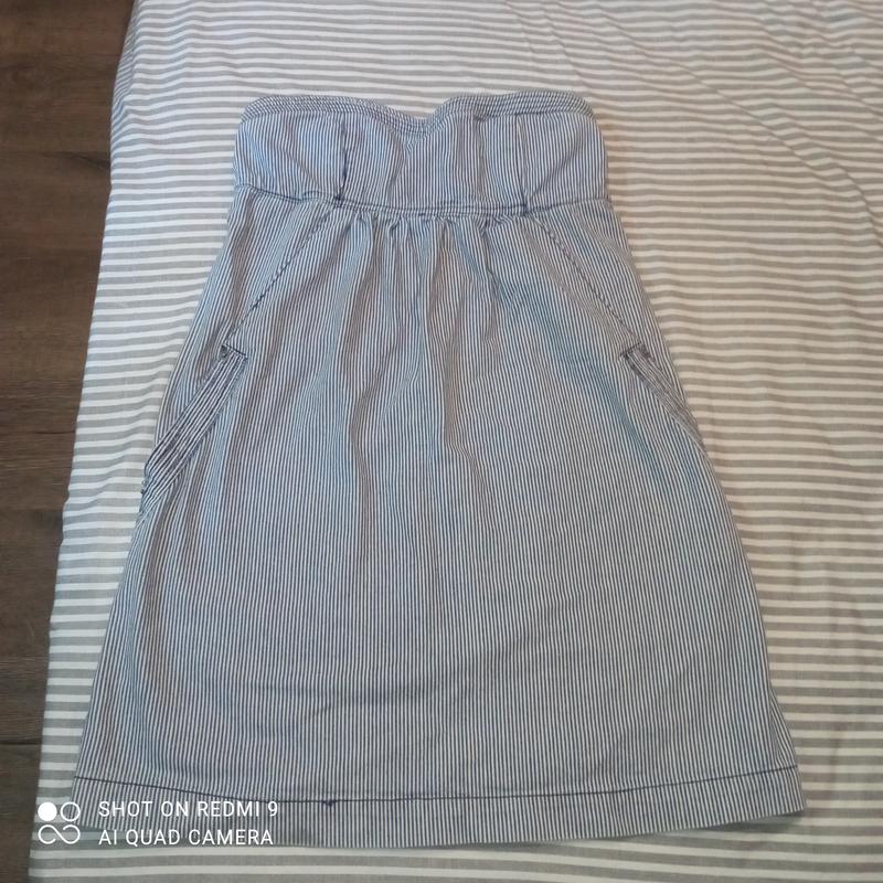 Міні - плаття в дрібну смужку. Без бретелей. Ззаду на блискавці.Розмір ХС. Підійде на С. Блискавка робоча. По боках кишені.Поб 48 см Довжина 65 див. Пог 35 див. У відмінному стані. Доп. Фото за запитом.