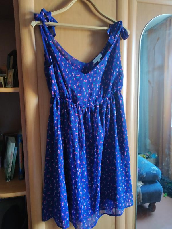синее шифоновое платье с завязками на плечах. резинка под грудью- не на талии. размер на этикетке- М,но можно и на L.