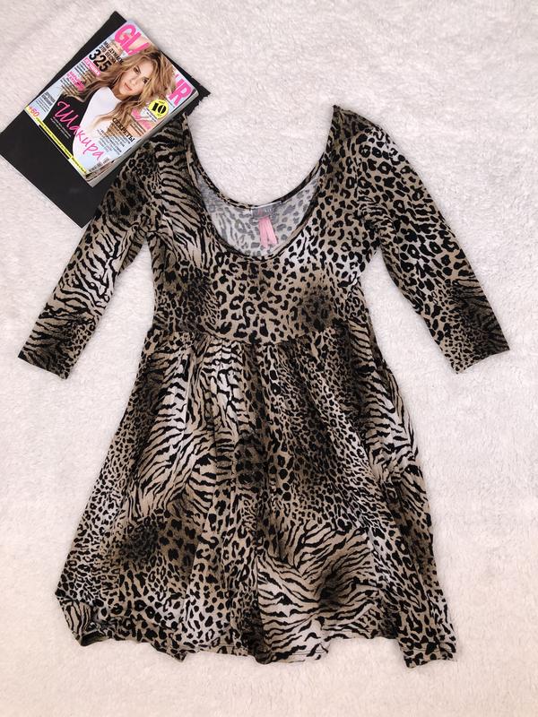 Стильне плаття міні в тваринний принт. Ідеально нова річ. Висока посадка,ідеально підкреслює груди,а низ йде вільного крою. Оголена спинка. Натуральна тканина, приємна до тіла Заміри Довжина-67 П. о. м-40 П. о. т-32 Рукав -41 100% віскоза,матеріал тягнеться