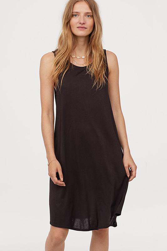 сукня силуету трапеція від бренду H&M розм. S № ********** Мірки: пог 47см, довжина 83см Коротка сукня-трапеція без рукавів з м'якого віскозного трикотажу. Склад: 100% віскоза