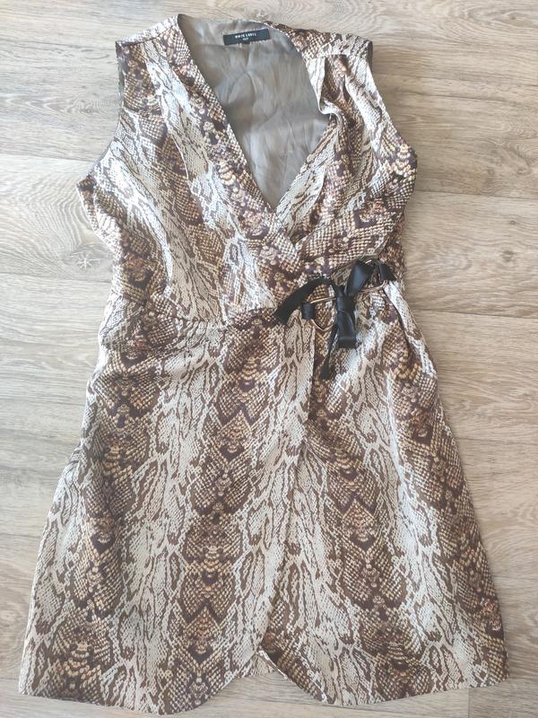 Міні сукня,можна носити з брюками як жакет,на розмір 50-52,на підкладі.оченята ефектно виглядає.надіто кілька разів,речі,всі мої секонд не продаю. Довжина 90-91 Пог 54-60(спереду запах) Піт 54-46(втягується на бант) Побіди 57-62(запах спереду) Сукня не розкривається повністю(як халат запах зафіксовано.на підкладці