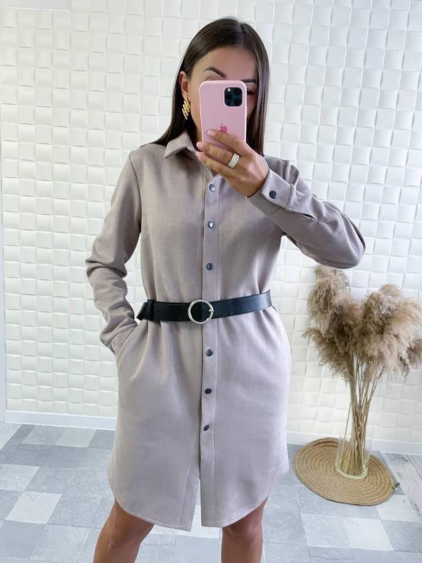 НОВИНКА❣ Плаття Розміри: 42-44, 46-48 Тканина: замш на дайвінг Кольори: бордо, чорний, пляшка, беж (Пояс в комплекті) Стильна сукня-сорочка на цей сезон. Вільний комфортний крій, якісна турецька фурнітура, доповнює образ пояс, який йде в комплекті з платтям.