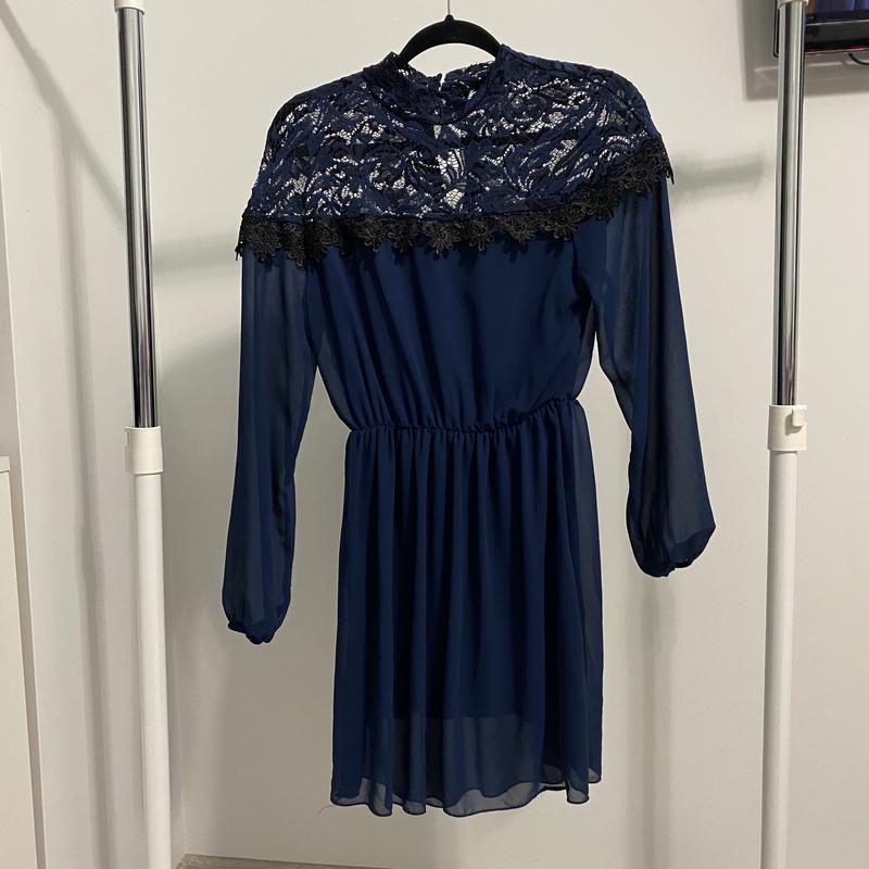 Шифонове темно синє плаття, з ажурним верхом, на талії з резинкою, має підкладку, добре тягнеться Пог 41 Побіди 46-47 так як вільне внизу Довжина 89 Довжина рукава 61