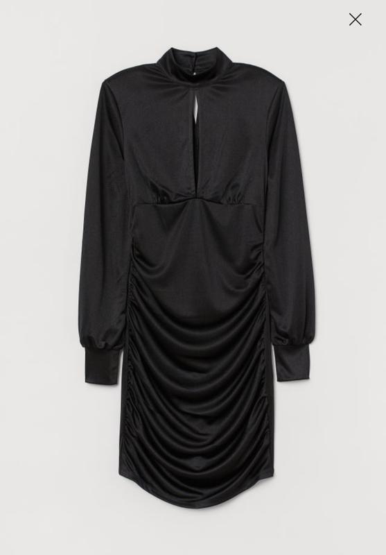 Коротке плаття з блискучого трикотажу стретч. Комір стійка, виріз спереду і невеликий виріз на гудзиках на комірі ззаду. Підплічники, довгі рукави з манжетами на гудзику, шов під грудьми і призібрані бічні шви для ефекту драпірування. Без підкладки. Розмір вказано xl, але орієнтуватися по замірах Довжина: 99см. Пог: 52см, максимум 60 Пот49см ПОБ: 51см.