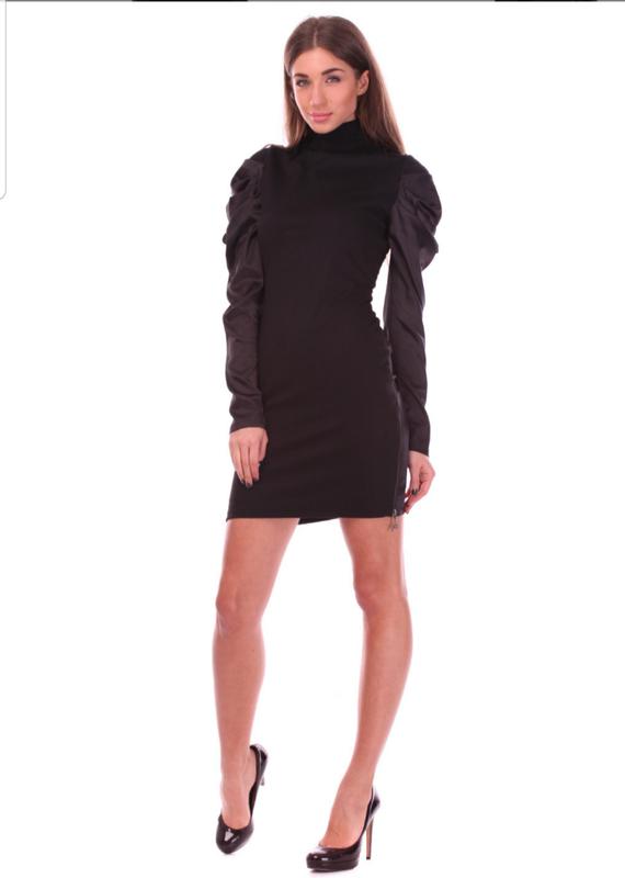 Маленьке чорне плаття облягаючого силуету. З двома розрізами на блискавці з боків. Брендовий фурнітура. Склад 95% поліестер, 5% еластан. Перед сукні віскоза, ззаду і рукава атлас. Розмір S-M. Одягнене 1 раз, стан нового.