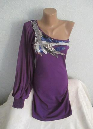 Девочки, платье обворожительное, эффектное, оригинальное, насыщенно-фиолетового цвета на одно плечо с широчезным шифоновым одним рукавчиком на манжете ( с резинок ), спереди вышитым ажурным украшением из паеток ( круглых и квадратных ), бисера и металлических заклёпок. Смотрится сказочно-красиво, эффектно и отличнейше подчёркивает фигурку! Размер указан 10\38, наш 42-44, замеры: длина от плеча 85 см, ПОГ 40 см ( ОГ до 88 см ), ПОТ 35 см, ПОБ 42 см, рукав сверху ( от горловины ) 75 см ( вместе с манжетом ), снизу 63 см. Ткань, состав: 67% вискоза, 28% полиэстер, 5% эластан, приятная, плотная, немного тянется. Бренд - Quiz. Спрашивайте, пожалуйста, крутое и шикарное платье, будете выглядеть в таком всегда оригинально и эффектно! Доставка УП ( + 25 грн. ) или НП;-)...