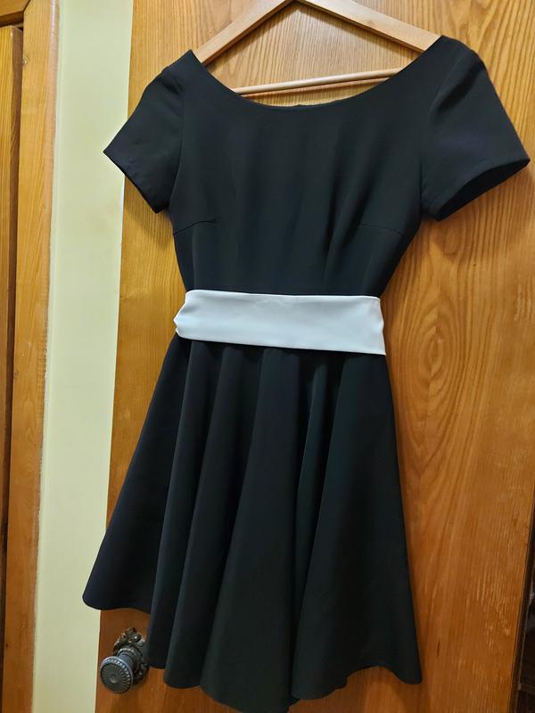 черное платье красиво прилегает к телу,в комплекте атласный пояс и есть фатин(если надо) Размер s-m.Красивый v-образный вырез на спинке