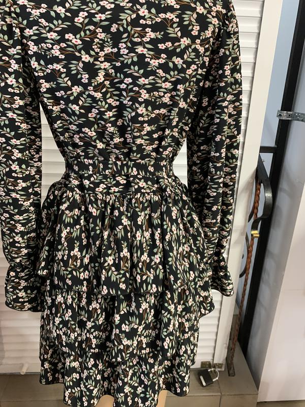 Платье короткое с длинным рукавом.Застегивается на пуговки юбка с рюшками .Модный рисунок в мелкий цветок.Размер С.Рукав внизу на сборке при помощи резинки