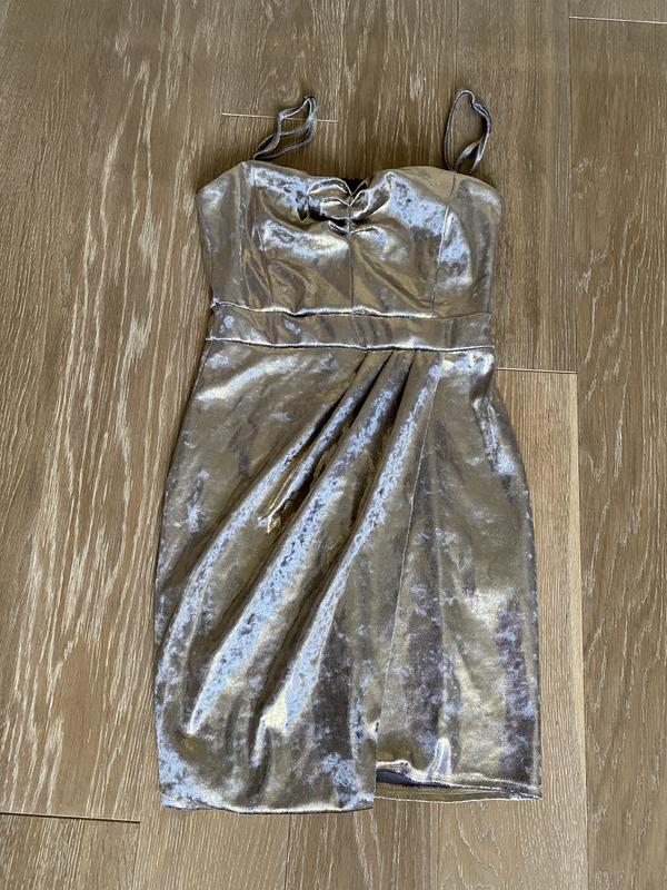 Красивое платье к предстоящим праздникам, приятное к телу, серебристо-золотое, отлично садится, одевалось один раз, состояние нового. Размер С.