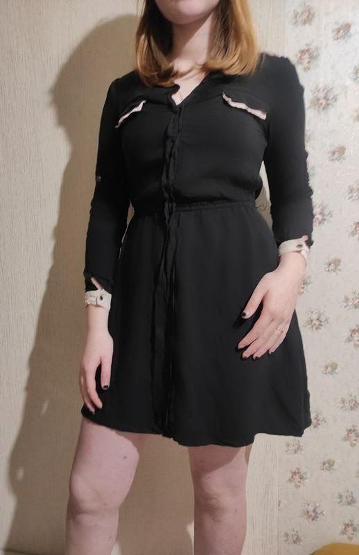 Плаття чорне Має бежеві вставки з ґудзиками (див. на фото) Рукав може закочуватися і зверху закріплюватися Має підкладку На талії є резинка яка гарно підкреслює фігуру Плаття зручне, неймовірно легеньке, підійде на будь-який тип фігури Із мінусів: мнеться, ґудзики трішки постиралися (див. на фото) За детальнішою інформацією - звертайтеся. Із задоволенням відповім на всі ваші запитання ❤️