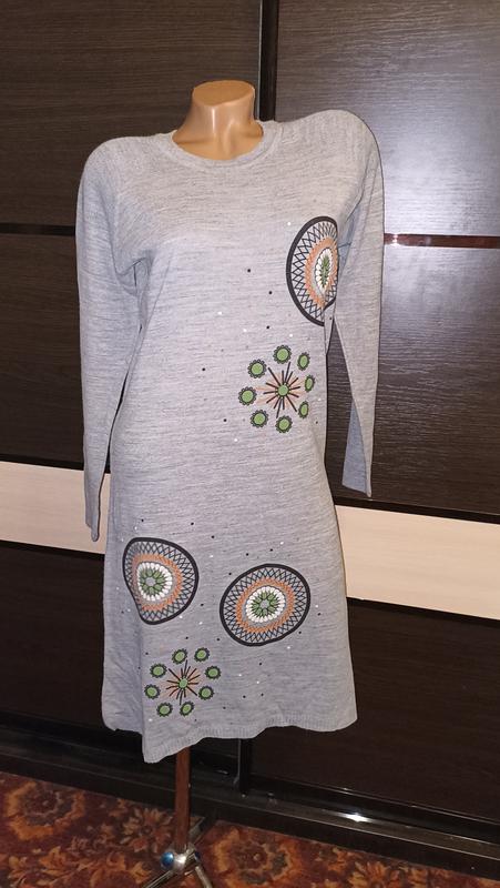 Шикарне плаття, тепле. Прикрашено малюнками. Рукавчик реглан. Нове, залишок з магазину. Бірочка відірвана в магазині, і з-за цього ззаду на комірці зацвіло пару петельок. Зашили. (останнє фото) Але під волоссям буде ідеально. Нюанс враховано в ціні. ОГ 102-116 см ВІД 88-102 см ПРО 100-116 см Рукавчик від горловини 69 см Довжина 96 см