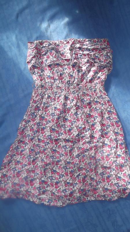 Літнє плаття з рюшами спереду в квіточку. По грудях 40-45 см, довжина 72 см, по талії 32-45 см)