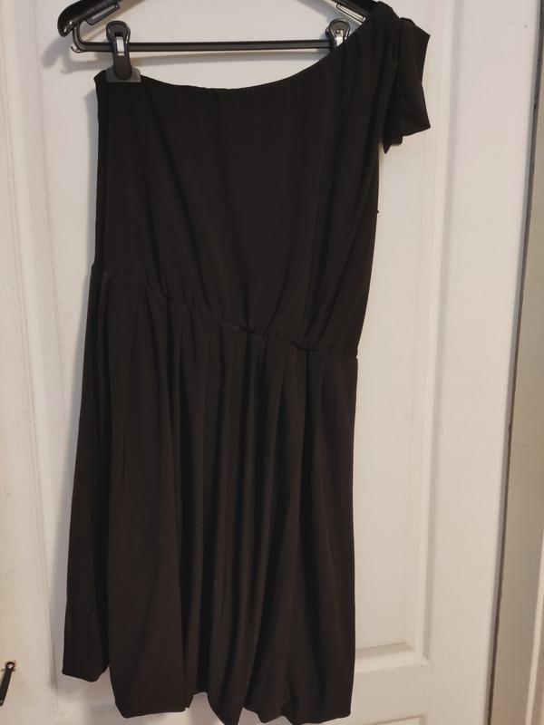 Черное нарядное платье на одно плечо. Эффектно, ничего лишнего. Талия на резинке. По низу подкладка пришита к подолу. На плече декоративный элемент а-ля бант, лаконичный - полоса ткани перехвачена поперек посередине. ПОГ 44, ПОТ 40, длина юбки от талии 52 По талии и груди Замеры в спокойном состоянии, есть ещё минимум +3-5см при растягивании.