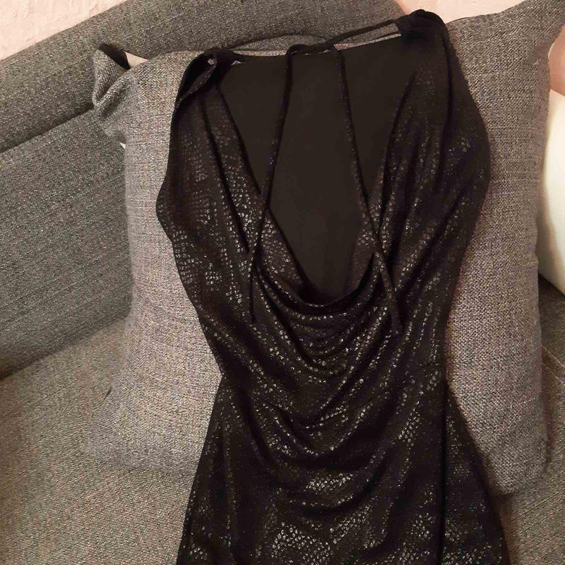 Стильне платтячко зміїний принт,з малим напиленням люрексу,що надає сукні сяючий ефект, дуже гарно переливається, чорного кольору,спина оголенаная на зав'язках зверху,розмір s