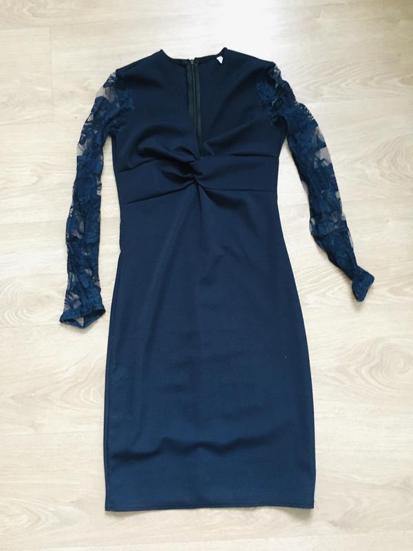 Платье темно-синего цвета с кружевными рукавами, на худенькую девушку. Одевала 2 раза на праздники. Состояние в целом идеальное, один нюанс на рукавах немного есть следов от резинки с кружева (на фото показала), но они не очень заметны, если только присмотреться. В цене учла