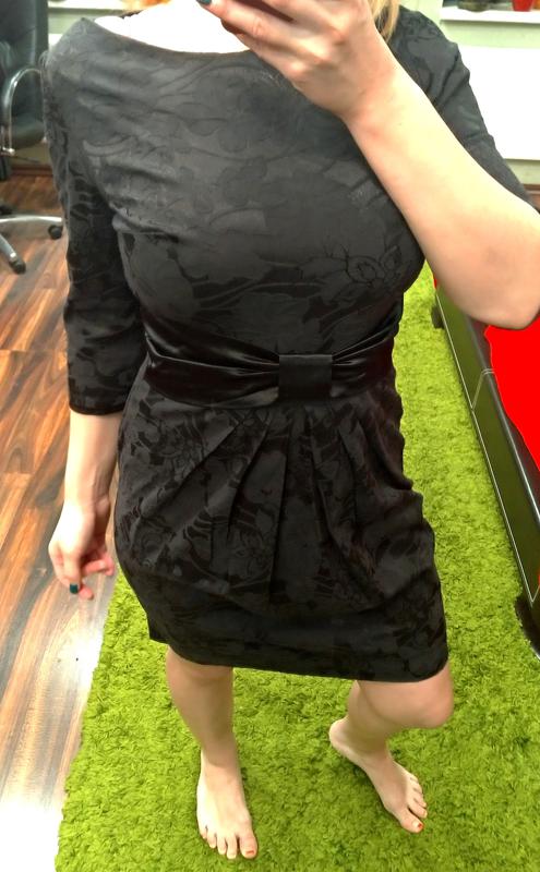 Чорна сукня на потаємній блискавці з невеликим розрізом позаду. Рукав 3/4. Тканина схожа на не щільний жаккард. На талії спереду нашитий атлас у вигляді банта. Попереду спідниця пошита в складочку, за рахунок цього підійде для дівчат в положенні з невеликим животиком.