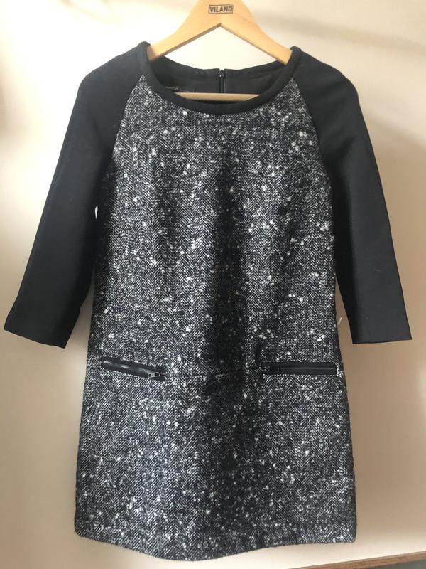 Шерстяное платье «mango», серый меланж, с контрастным рукавом чёрного цвета, с декоративными карманами, застежка на спине на молнию Состояние идеальное Размер на бирке XS, подойдёт и на S