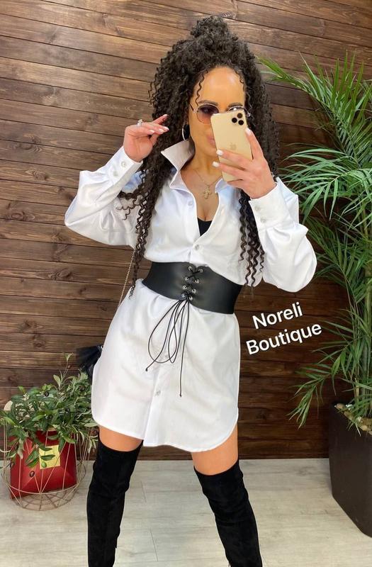 ⏳Модное платье-рубашка «СЕЛИН»свободного кроя🔝 ▫️ткань креп-костюмка ▫️размер единый (42-48) ▫️Горловина обработана отложным воротником со стойкой ▫️Застежка спереди на планке с пуговицами ▫️Кожаный корсет входит в комплект ✂️Длина 90 см