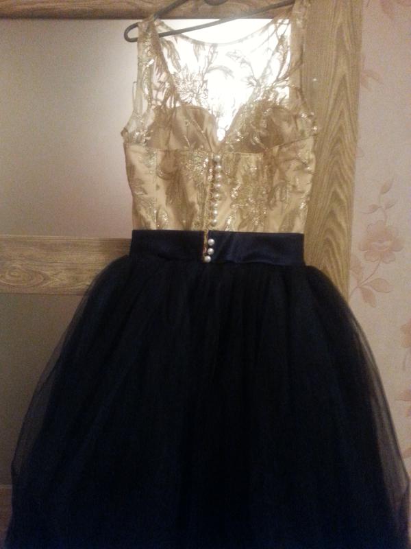 Нове вечірнє плаття, одягнене 1 раз, розмір 40-42 на тендітну дівчину. Верх - бежево-золотистий гіпюр, низ темно-синя багатошарова спідниця сітка. Спинка прикрашена гудзиками.