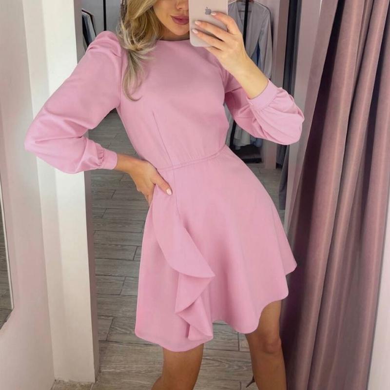 #Плаття Артикул: 887-014 Колір: пудра , молоко , чорний , олива Розміри: 42-44, 46-48 Матеріал: креп костюмка Сукню з воланчиком