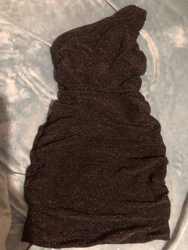 Чёрное платье с серебряной люрексовой нитью на одно плечо, очень эффектное и нарядное в Реале . Подходит на размер С-М. Состояние нового .