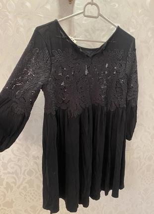 Шкодное интересное платье, можно носить как тунику под лосины, очень мягинькое приятное к телу на груди и рукавах вышито кружево, состояние идеальное,одето пару раз, не подошёл размер, подойдёт на размер s-m