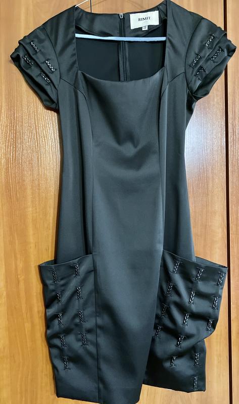 Стильне чорне атласне плаття. Вставки з еко-шкіри у вигляді косичок на рукавах та на кишенях. Позаду стрічка, яку можна використовувати як пояс.