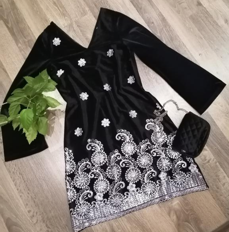 Дуже гарна сукня. Стан ідеальний. Дефектів і слідів носіння немає. На вигляд, як нове. Рукав розширений до низу, модель сукні трапеції. Білі квіти обшиті блискітками. Тканина мягенька, приємна до тіла, під велюр. Колір - насичений чорний. Збоку замочок. Добре тягнеться. На бірці розмір uk 10,evr38. Відправлення одразу) Якщо потрібно заміри - пишіть.