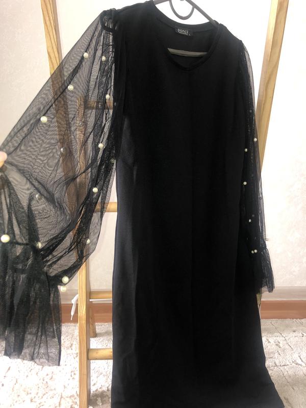 Продам чорну нову сукню. Стан - НОВА. Рукав з бусінками. Заміри Пів обхват грудей 41 Талія 40 Бедра46 Довжина рукава від плеча 59 Заг довжина 100 см Заміри зроблені без натягу. Тканина тягнеться і гарно підкреслює фігуру