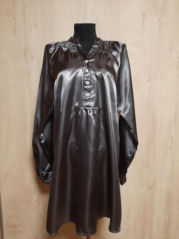Платье из серой атласной ткани . Рукав реглан снизу на резинке, пуговки, интересный крой. Подойдет для размера М, L. Замер: пог 55см, длина 83см, рукав от линии шеи 75см.