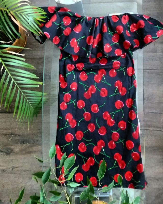 Літнє плаття, з щільної тканини. Відкриті плечі , з рюшами . Чорного кольору з принтом черешні .
