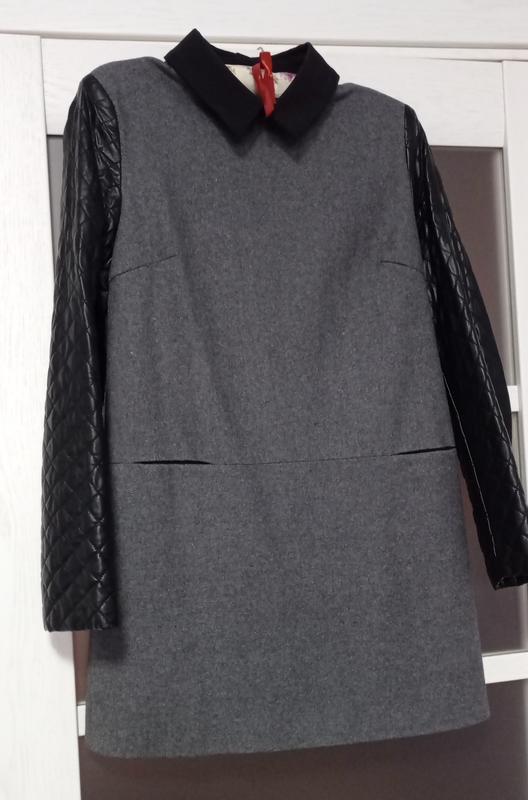 Сукня красивого сірого кольору, з контрастним коміром, чорного кольору, з стьобаними руками з Еко шкіри. Спереду дві прорізні кишені. На спині блискавка і кнопка. Сукня виконана із щільної тканини, з підкладкою, прямого крою, з невеликими підплічниками. В ідеальному стані. Плечі 39 см, Рукав 62 см ПОГ 47 см ПОТ 46 см ПОБІДИ 50 см Довжина 79 см
