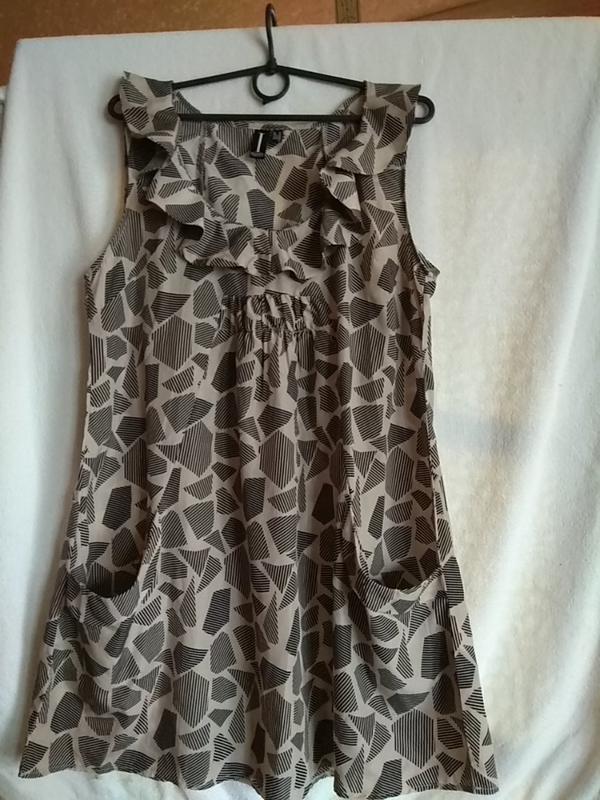 Дуже жіночна, оригінальне плаття. Відомого британського бренду. Довжина 90 див. В плечах 38 див. ПОГ 52 см, розкльошені трапецією до низу. Спереду і по спинці присобрано на тоненькій гумці. Два функціональних кишені. Ніжна оборка по вирізом спереду і ззаду, дуже гарно лягає. Виріз ефектно відкриває груди. Тканина дуже якісна, приємна до тіла. Не парить. В пастельних сірих тонах. Стан нової речі без паперової бирки. Сліди шкарпетки відсутні. Дефектів немає.