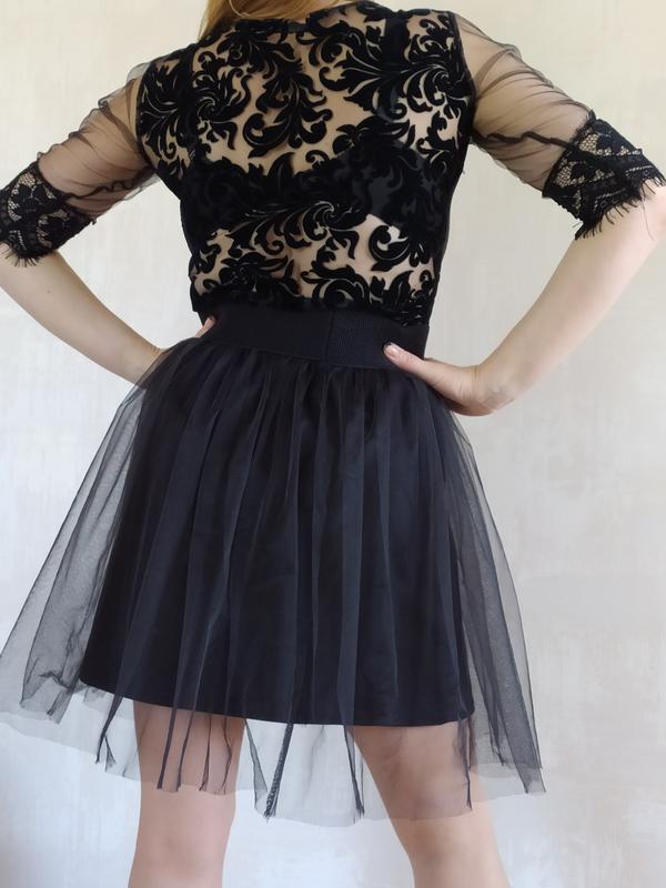 Красиве нарядне плаття. Фатиновая спідниця знімається, що дозволяє носити сукні в різних варіантах. Ззаду гарна спинка з вибитого замшевого малюнка. Під пахвами біля грудей є незначні катишки, їх можна прибрати машинкою для катишків( у мене просто не немає, прибрала б сама). Розмір на бірці 46-48(підійде на М-L) Додаткові заміри на вимогу