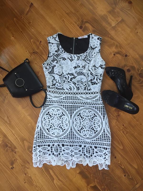 Стильне, мереживне плаття чорно-білого кольору з відрізною імітацією. На талії смужка без підкладки. Мереживо досить плотне. Розмір М