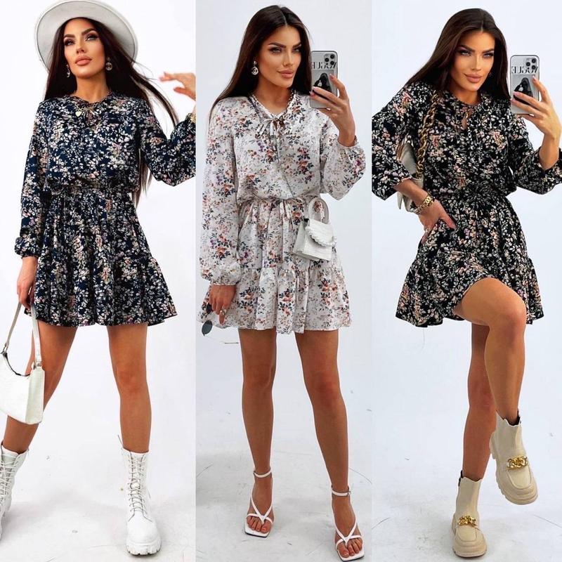 Сукня вільного крою. 468 Весняний ніжний принт Розміри: S, M, L, XL Матеріал: турецький софт (дуже приємний до тіла) Колір: білий, темно-синій, чорний Модель вільного крою, з довгим рукавом, манжет на гумці, горловина з невеликим V-подібним вирізом, регулюється завязками. По низу сукні декороване конфігураційних рюшем. В комплекті поясок. Можна носити як з пояском так і без. Супер якість.