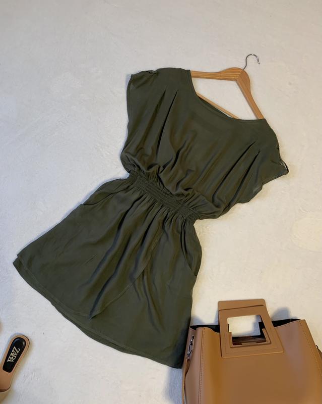 Літнє плаття з тонкої приємної на дотик тканини кольору хакі на резинці colin's розмір вказано L підійде на М є бокові кишені і спідниця має підкладку З грудей 56см, пояс 28см, тягнеться до 41см, довжина спідниці 46см.