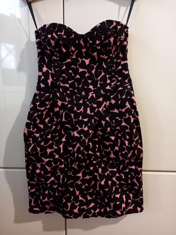Милое мини платье H&M, р.XS (34), состояние нового, отрезное в талии, интересная форма юбки с косыми складками, создающими красивый силует. Сверху внутри силиконовая лента, при желании можно пришить бретельки. Состав 100% хлопок. Размеры: пог -35-36 пот - 32-33 поб - 43-46 длина общая - 60,5 высота верха до подмышки - 17,5 высота юбки - 43 ширина низа - 44
