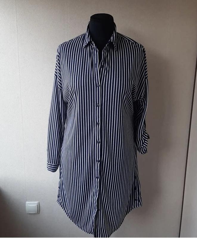 стильне плаття-сорочка благородного темно синього кольору в білу смужку розмір М ОГ 110см ВІД 110см ПРО 110см 96см Довжина Плече спущено рукава можна закріпити на гудзичку ціна - 350 грн Для замовлення пиши в Директ