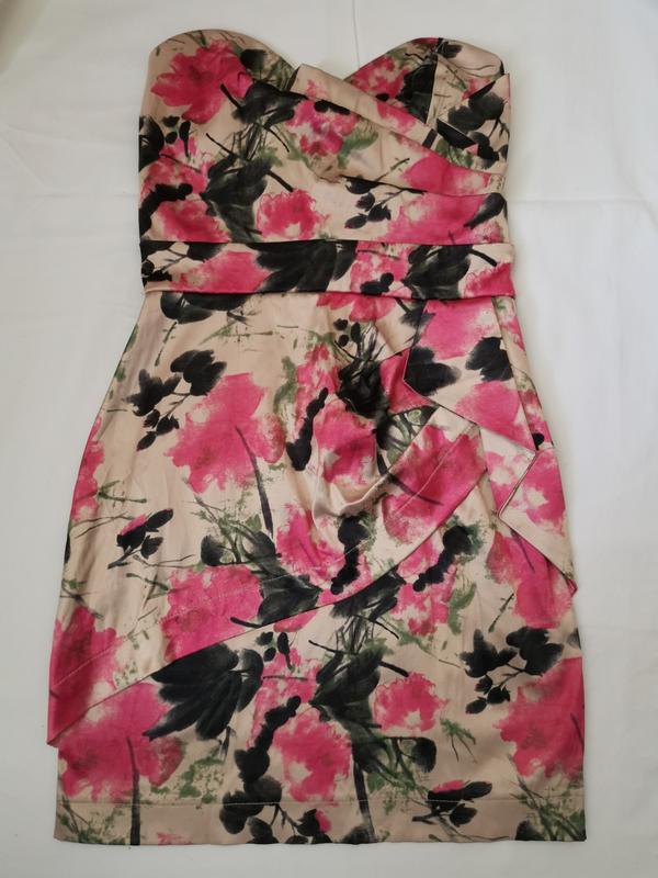 Платье атласное, кофейное с розовыми цветами. Длина по спине - 59 Длина спереди от верхней точки до низа-67см От паха до паха-34см(тянется до 40см) По талии-32см