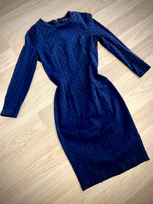 Плаття темно синього кольору у чорний горошок, сідає плавно по фігурі