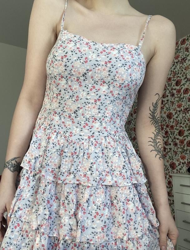 Платтячко в душе хорошому стані, з класним принтом. Верхня частина як корсет, не тугий, спинка на резинці. Розмір s, але на м також сидить гарно.