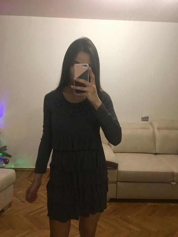 сукню Ззаду рівне розмір С-М,тягнеться довга від плеча 76 см, рукав-55 Шугало, без дефектів Одягнене на зріст 165 см, параметри 85-63-95