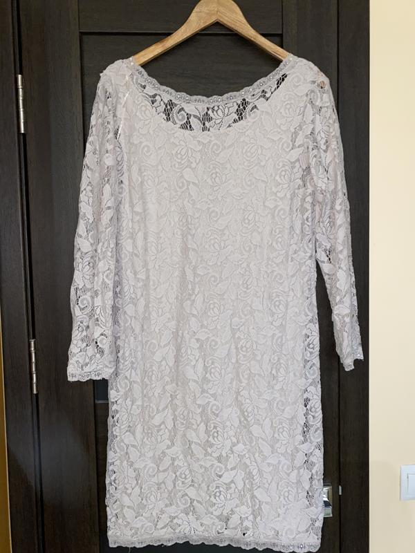 Чарівне мереживну сукню сіро-бежевого кольору. Виріз горловини на спинці трохи глибше ніж по переду. Пог 55 (+тягнеться), довжина рукава 57 см, довжина виробу 100 см