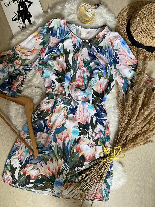 Красива сукня міні в цікавий принт!Тканина натуральна!Н&М підійде на розмір С М ширина від підмишки до підмишки 46см довжина виробу 85см ПОТ46см ПОБ49см рукав 3/4
