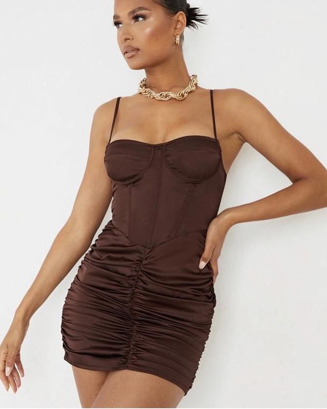 Сукня,яка полонить твоє серце♥️ Шоколадний атласний матеріал з корсетним дизайном Довжина 91.5 см 🔹розмір s🔹 На обхват грудей до 86см На обхват талії до 68 см На обхват стегон до 94 см