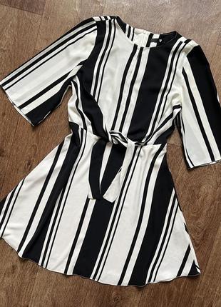 Плаття в смужку розмір М, довжина 91 см, ПОГ 44 см, ПОТ 39 см, ПОБІДИ 61 см, довжина рукава 38 см, на грудях є розріз, спереду зав'язується, застібається ззаду на блискавку, не просвічується, є підкладка, 95% поліестер, 5% еластан