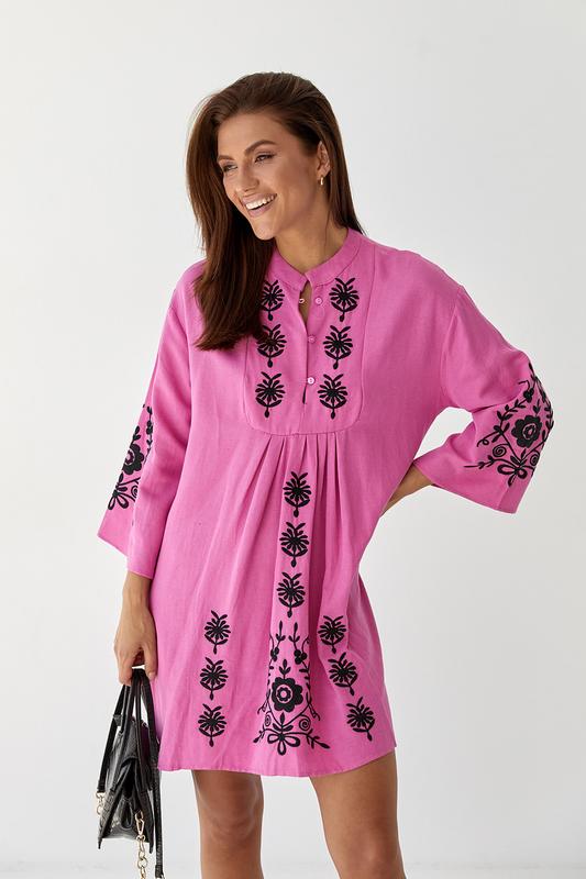 Це вишите плаття стане вашим улюбленим вбранням для свят і не тільки. Носіть його як можна частіше, і нехай кожен ваш день буде особливим! Ця модель йде з четвертными широкими рукавами. Кругла горловина обшита коротким коміром-стійкою. Спереду по центру розташована планка, яка застібається на три ґудзики. На рукавах, по центру, а також внизу розташовані великі візерунки з машинної вишивки гладдю. Завдяки вільному крою плаття виходить універсальним і підходить жінкам будь-якого віку і з будь-якою фігурою. 🌱колір: молочний , рожевий 🌱розмір: S, M ,L 🌱склад: 100% віскоза