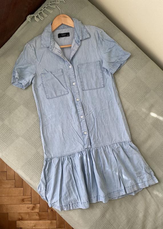 Голубеньке плаття під джинс. Тканина приємна до тіла, не парить. Розмір зазначено 34. Але буде добре на С і М. Плечі 39см. Груди 45см. Бедра 47см. Довжина 90см.
