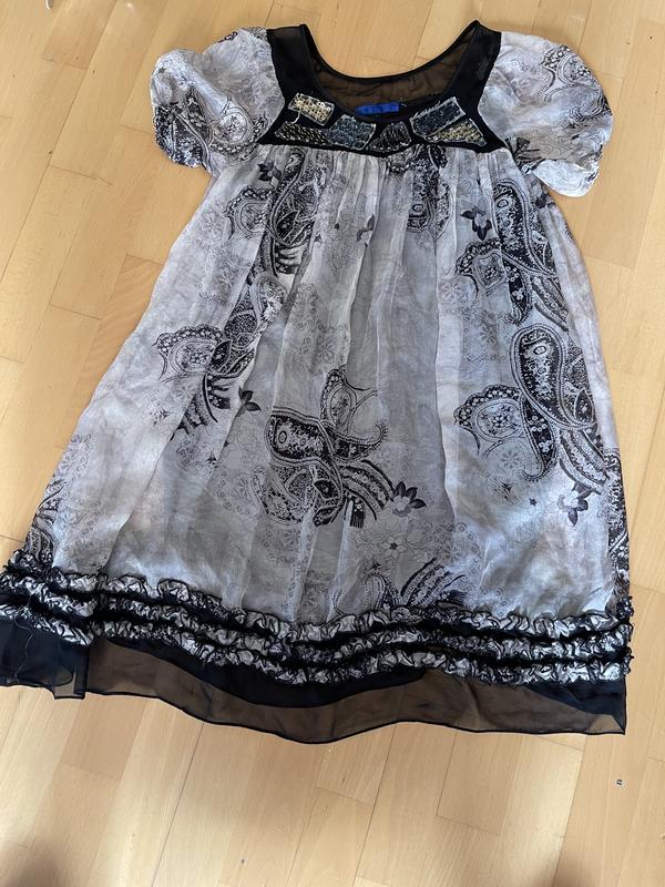 Короткий шовкове напівпрозоре плаття на підкладці. Розмір 2. Бренд Audrey Hepburn. ПОГ 42 см, тягнеться до 48 см, ПОБІДИ 48 см, тягнеться до 56 см, довжина 87 див. Дефектів немає.